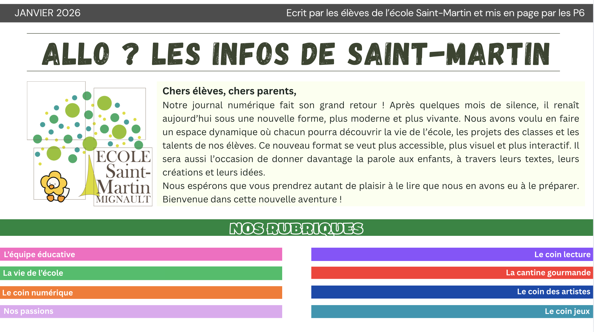 Chers parents, Nous avons le plaisir de vous proposer en avant-première la nouvelle édition du journal de l’école, désormais proposé dans un tout nouveau format numérique et interactif.. Le processus de ce projet a compté autant que son aboutissement : il nous a permis d’apprendre ensemble, d’innover, d’expérimenter, d’accepter l’erreur et de collaborer, bref de vivre pleinement